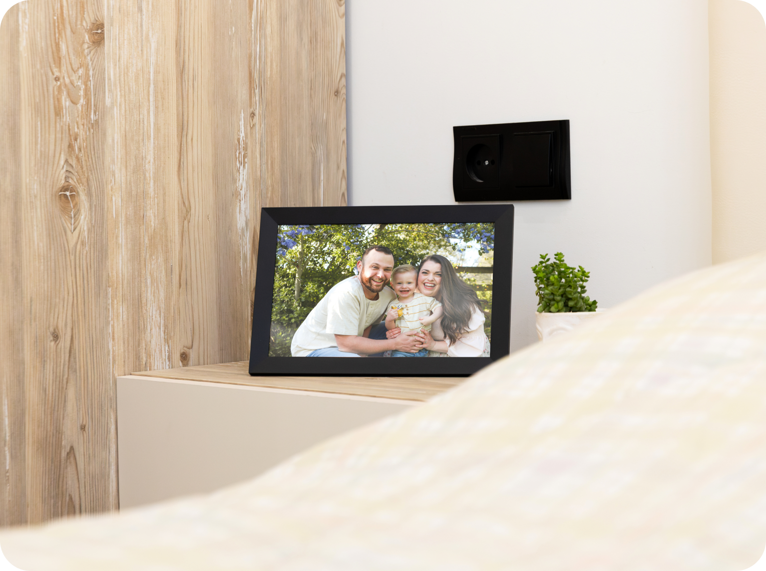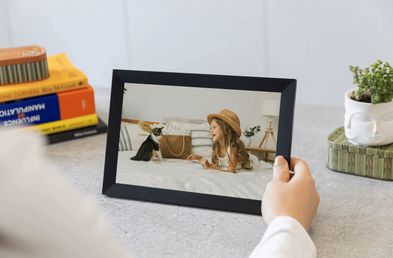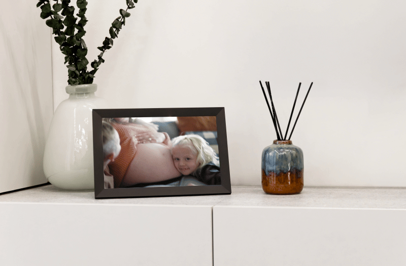 Setup takes about a minute. The bright, color-rich display looks great from any angle, new photo alerts feel like little surprises, and the built-in speaker lets you actually hear the laughs. It auto-rotates, sits beautifully on a desk or hangs on a wall—and the best part? The whole family can add memories together.